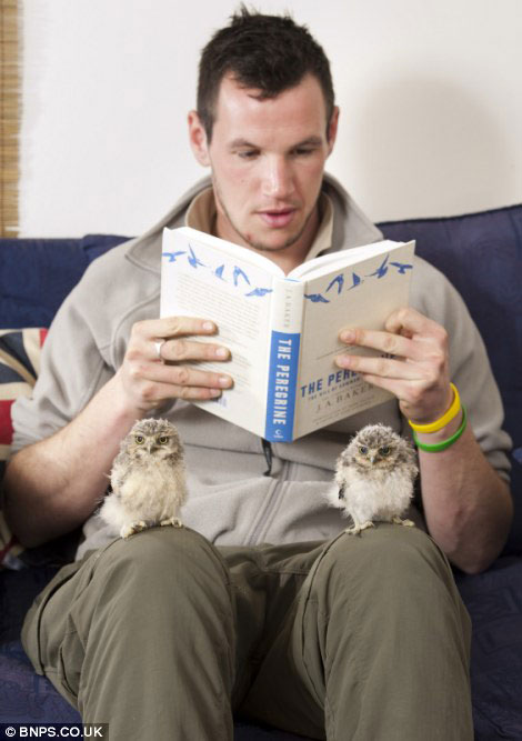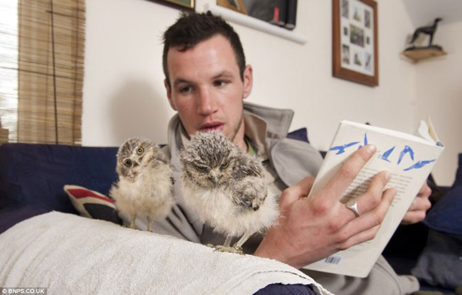 Os pequenos mochos têm apenas 6 semanas e nasceram numa incubadora, estando agora ao cuidado de Jimmy, que trabalha no Parque de Longleat Safari, em Wiltshire, sudoeste de Inglaterra.