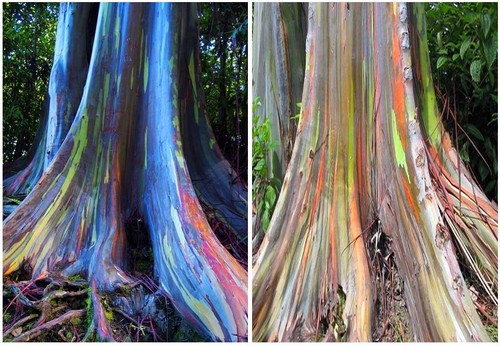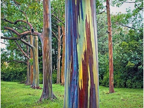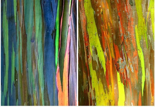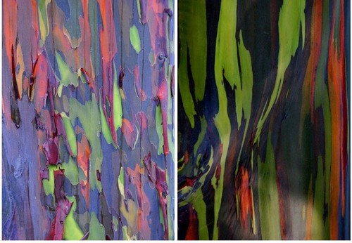 À primeira vista, pode parecer que a árvore tenha sido alvo de alguns grafiteiros. Nada está mais longe da realidade, porque a cor variada, que vê em seu tronco, é totalmente natural. Esta curiosa árvore pertence à espécie "Eucalyptus deglupta" e a coloração vistosa do seu tronco fez com que ganhasse o apelido de "eucalipto arco-iris".