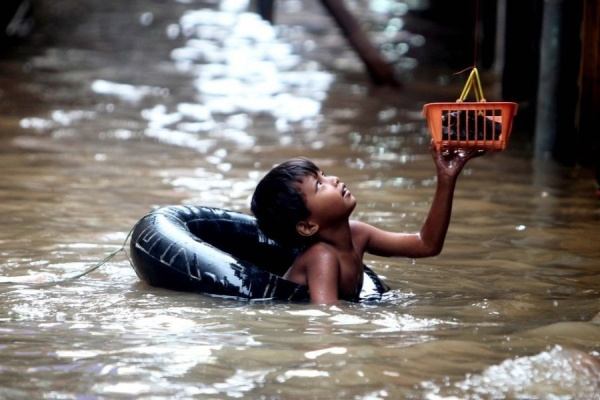 Rapaz salva o seu gato durante uma inundação.