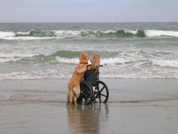 Uma mulher em cadeira de rodas e o seu cão contemplam juntos as ondas do mar.