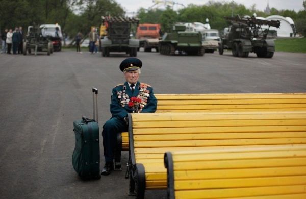 Um veterano da II Guerra Mundial sentado num banco, esperando ver amigos da sua unidade.