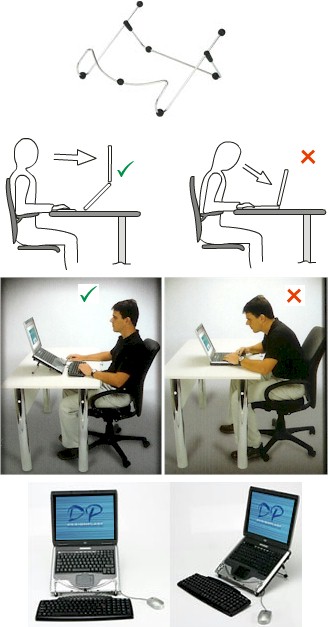 Segundo vários ergonomistas, a utilização do notebook fora da mesa e cadeiras apropriadas deve ser rápida. Para trabalhos mais demorados, eles indicam um suporte que levante a máquina, e que deixe o terço superior do écrã à altura dos olhos, rato e teclado externos e postura correcta.