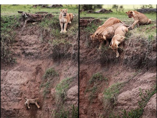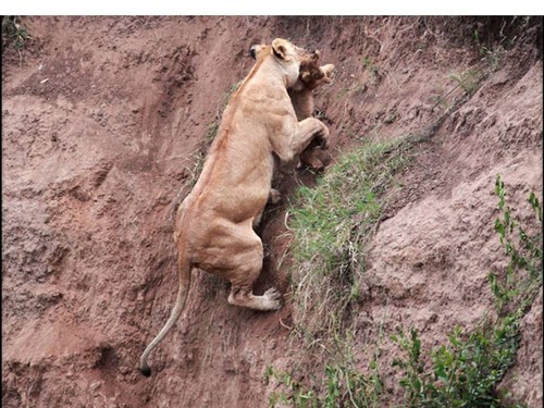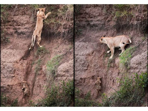 Essas dramáticas fotos, tiradas pelo fotógrafo Jean-François Largot na reserva de caça de Masai Mara, no Quênia, em agosto de 2011, mostram bem a preocupação da mãe leoa em resgatar seu filhote que estava a cair barranco abaixo. Outros “amigos” vieram em socorro, tentaram, mas desistiram ao perceber a dificuldade de acesso. Entretanto, a mãe leoa persistiu.