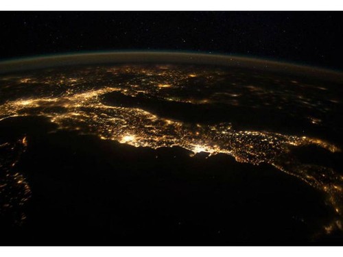 O panorama noturno inclui boa parte da Europa, mas mostra mais o território da Itália, cujo conhecido formato de bota é visível horizontalmente ao centro do quadro.