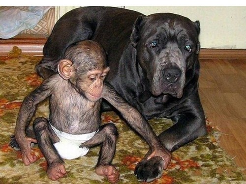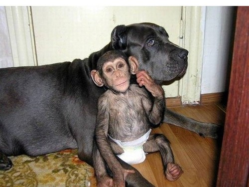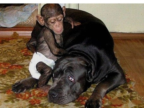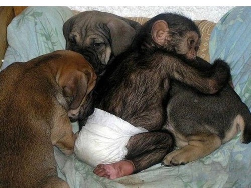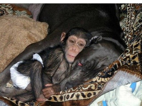 Saber exatamente o que se passou entre os animais é difícil de explicar… Talvez pela cadela ser de uma raça de cão amorosa e tranquila com a sua família e ter sentido um carinho pelo pequeno chimpanzé, logo pareciam uma família feliz. Os cachorrinhos e o chimpanzé até passaram a dormir juntos, a comer nos mesmos pratos, a dividir o amor de uma mesma mãe.