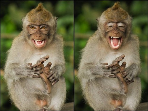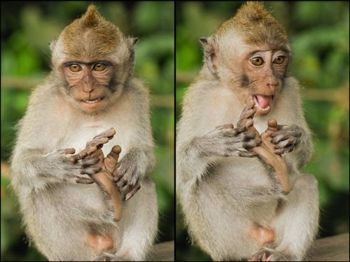 Foi então que Natalia percebeu uma cena curiosa… O que, a princípio, pareceu-lhe um macaquinho a coçar as patinhas, logo deu para ter certeza de que ele estava a divertir-se de uma forma muito original: ele fazia cócegas no próprio pé e caía na gargalhada. Natalia não resistiu e captou a brincadeira do macaquinho.