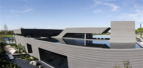 A construção possui uma estrutura horizontal com curvas realçadas. Estilo contemporâneo e conceitual, apresenta vários detalhes minimalistas.