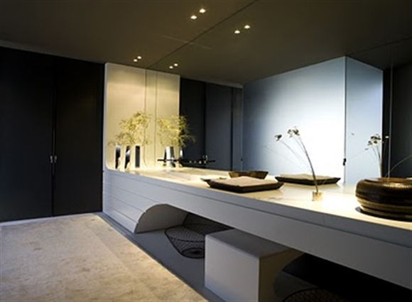 A decoração interna conta com muitas paredes, móveis e objectos brancos e os ambientes são climatizados com iluminação decorativa.