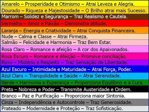 A esperança renasce… ou se fortalece. Com a chegada de 2013, pomo-nos a traçar objetivos, a planear metas, a pensar em novos desafios. Mas queremos estar bem, atrair boas energias. E as cores podem influenciar nosso estado de espírito, trazer bons fluídos para o novo ano. Confira na tabela abaixo o significado de cada cor… e use sua criatividade não só na roupa, como também nos acessórios, esmalte, maquiagem. Divirta-se com a magia de tantas possibilidades ao nosso alcance…