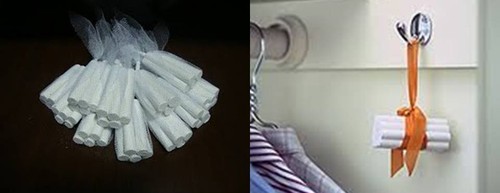Outra ideia de espalhar gizes nos armários... Se tiver aqueles ganchinhos, basta amarrar alguns com uma fitinha e pronto. Fica bonitinho também... e resolve na mesma.